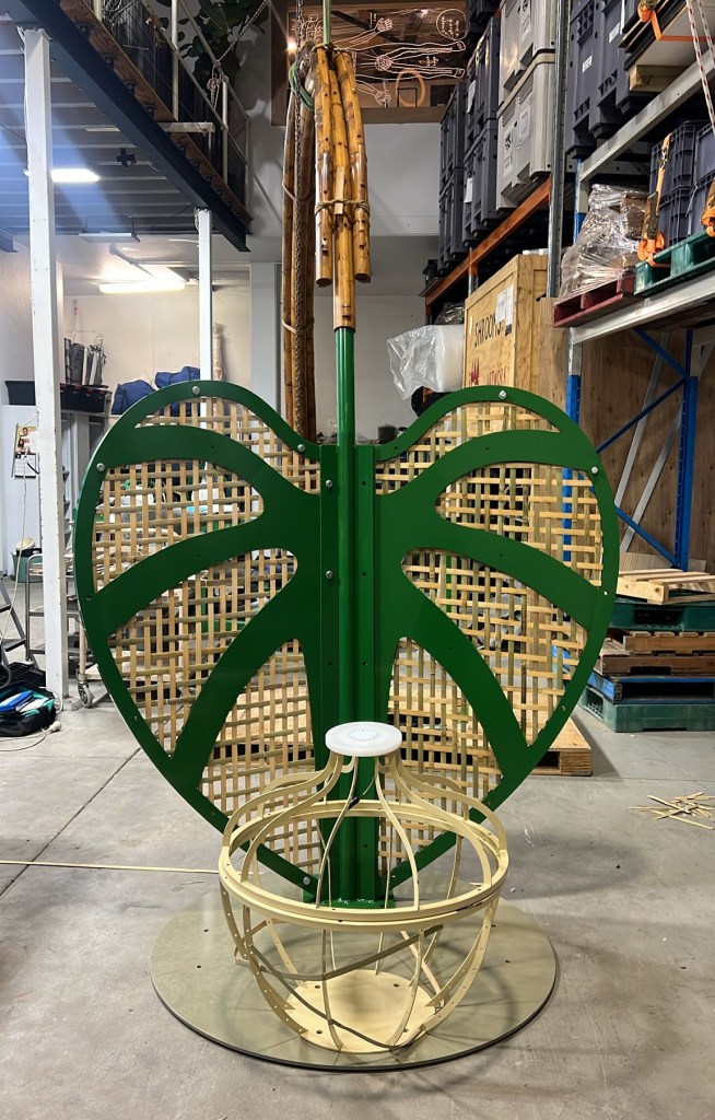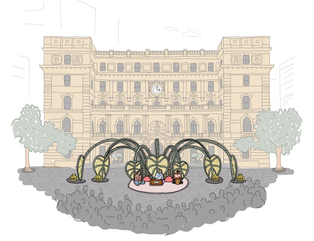 This immersive artwork is dedicated to Rohingya stories and their current experience of living in statelessness. Through music, light, and poetry, it stands as a defiant symbol of culture, solidarity, and existence. Sixteen towering taro leaves arch from its centre, forming a space that invites reflection, connection, and gathering.