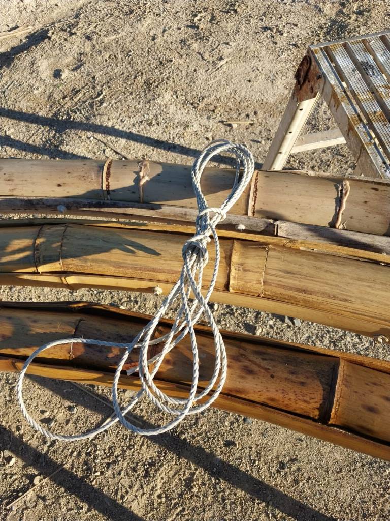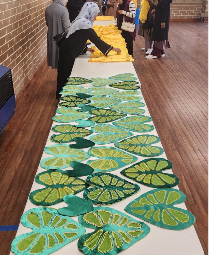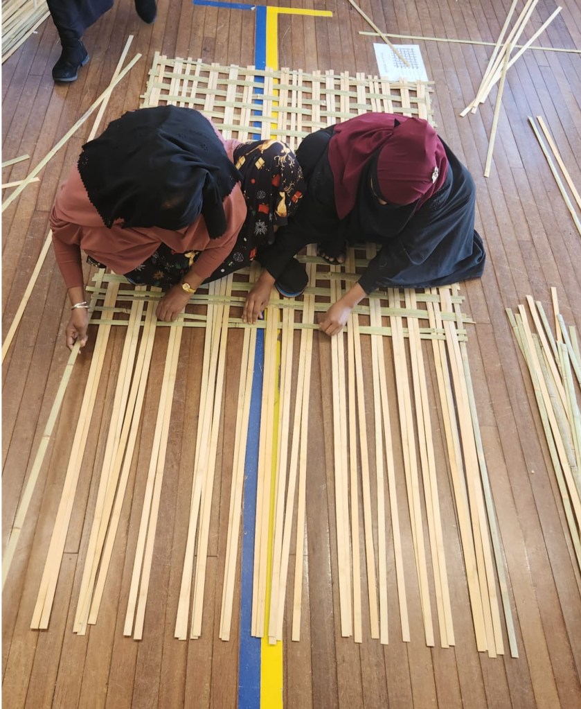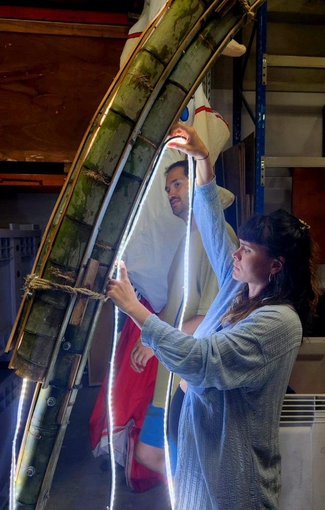 The build of the art-work was led by Amigo and Amigo and Lucid Space Design. However, over the past year Rohingya and Australian artists and allies have gathered in Lakemba and Marrickville to collaboratively make parts of the artwork, including weaving the Taro Leafs and Water jugs in Bamboo and rope. Over 150 people have been involved in this making, while exchanging skills, stores, food and gradually building a bigger community around the artwork.