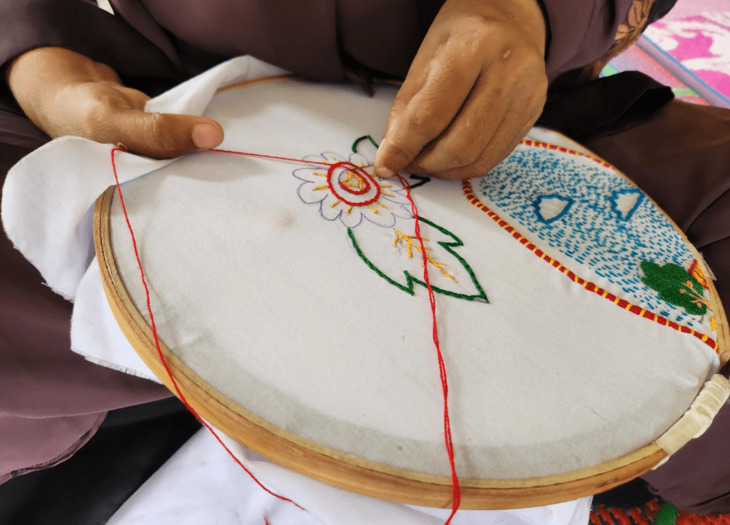 Senu trained in weaving through a vocational program in Myanmar when she was 23 years old. She is used to making lungis, scarves, pillow covers, and bedsheets. Her embroidery carries both cultural memory and quiet resistance.