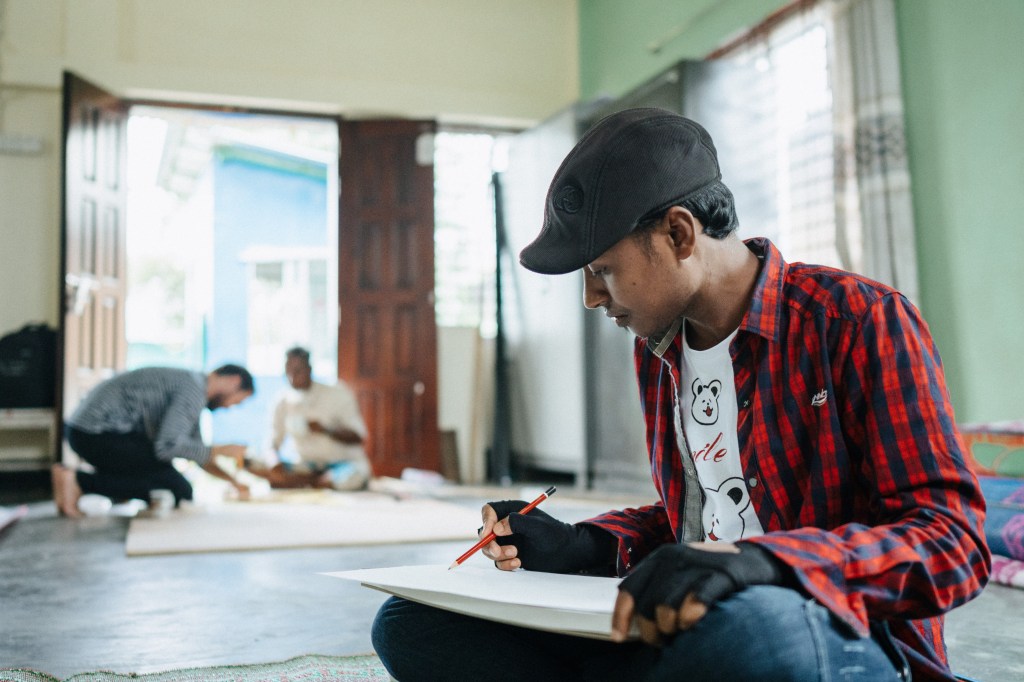 Faruk was the lead illustrator, a self-taught artist, who also aspires to be a photographer. His earliest inspiration came from cinema sign painters in Maungdaw. “I watched them draw heroes and heroines. I didn’t have pencils or paper, but I drew anyway — a rabbit was my first. The face looked right. The body didn’t. We didn’t have birthday parties. So I don’t know how old I was, maybe 10 or 11 when I started. I never did a course, but I learned by doing. Art is how I show the world who we are — that we are alive, that we have culture, that we still dream.” 10 other Rohingya kids also collaborated for two days creating additional frames and illustrations around Faruks work.