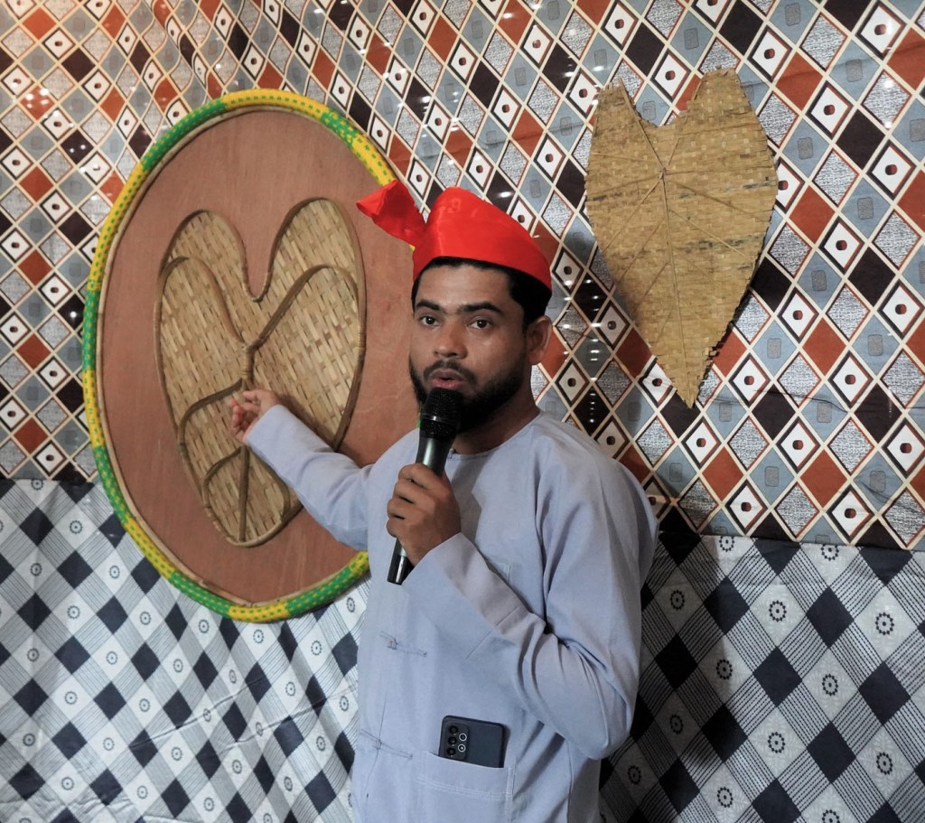 Yakub grew up surrounded by stories — first told by his mother and elders, then shared by him with children in the camps. “I’ve been storytelling since I was young, always with a focus on education, morals, and the culture we carry.” Now Yakub is a trained community journalist and producer. For the symbols project, he presents Nadtwa Fata — The Dancing Leaf — a story drawn from memory and reflection on his situation. “A journalist can destroy a country — or help rebuild it. I want to be a representative of Rohingya culture. If I can show the world that we also belong to Golden Arakan, maybe they will help us return.”